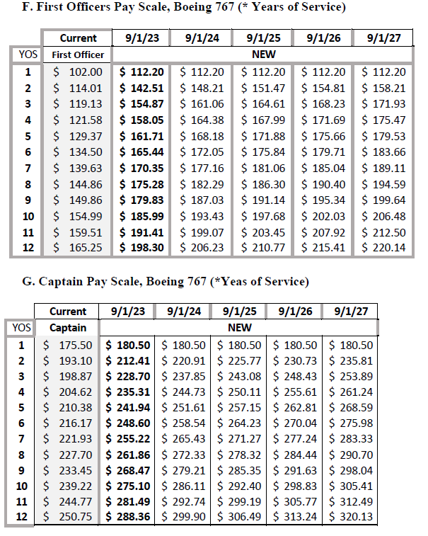 Pilots pay rates (for Captains and First Officers on both the Boeing 767 and 777) will be adjusted to be $1 higher than the highest rate at similar airlines (ATI, ABX, AmeriJet, Kalitta Air). If those carriers negotiate higher rates in the future, 21 Air will also increase its rates by $1 above them. The Boeing 777 now has its own formal pay scale.